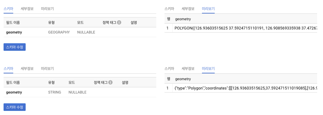 여기서 geometry:GEOGRAPHY 가 스키마입니다. 이를 다음의 구문에 붙여 넣고 실행하면 bigquery에 로드됩니다.