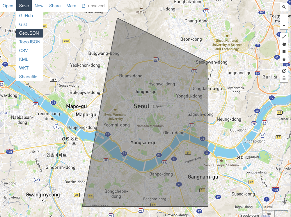 아래와 같이 지정하고 Save 부분을 누르면 geojson으로 다운로드 가능합니다.