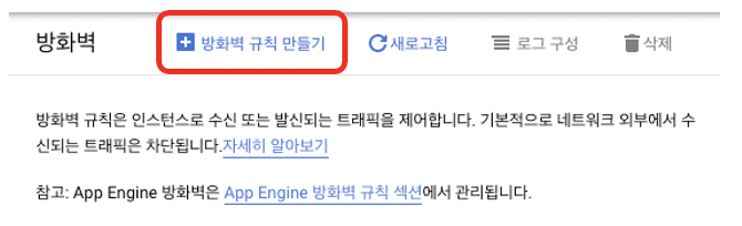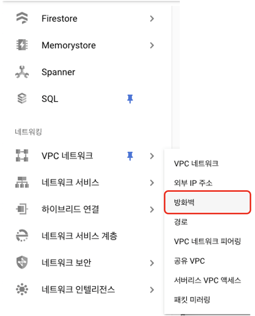 GCP에서 메뉴 부분에 "VPC네트워크" -> "방화벽" 으로 갑니다.