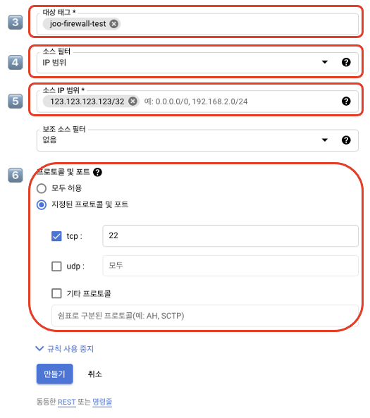 "방화벽 만들기"를 클릭하면 다음과 같이 화면이 나옵니다. 이 글의 경우 가장 기본을 설명하고 있기 때문에 아주 기본적인 설정만 하였습니다. 자세한 부분은 문서를 참고하여 읽어 보시는 것을 권장드립니다. (GCP 방화벽)