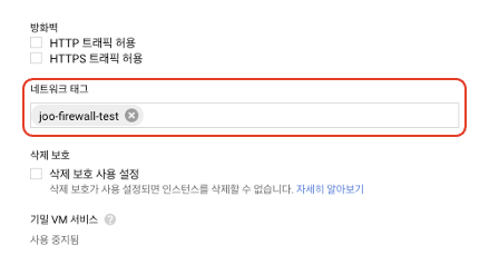 GCE에서 수정을 누르고 아래와 같이 네트워크 태그 부분에 아까 만들었던 방화벽의 네트워크 태그를 입력합니다. 앞서 언급했지만 이곳에는 방화벽 이름이 아니고 네트워크 태그 부분에 넣었던 명칭을 넣어야 연결됩니다. 저 같은 경우 그래서 방화벽 이름과 네트워크 태크를 동일하게 작성해서 관리하고 있습니다.