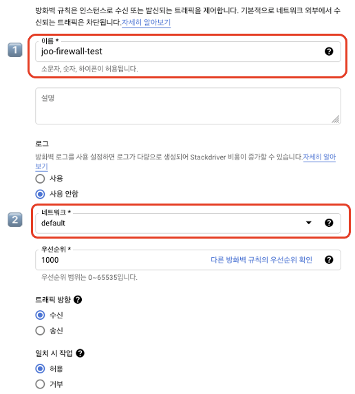 1. 우선 방화벽의 이름을 정해야 합니다. 방화벽 규칙 및 사용 목적에 맞게 각자 정하면 됩니다. 뒤에서 다시 설명 하겠지만 이것으로 방화벽을 구분하는 것이 아닌 단순한 이름입니다. 나중에 GCE 연결할 때 이름이 아닙니다.