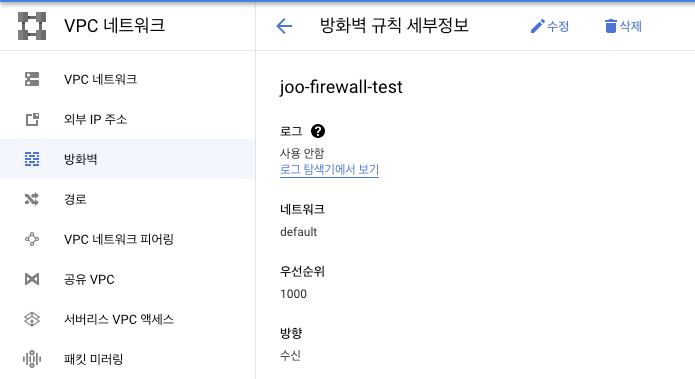 생성된 방화벽을 이제 GCE에 연결해보겠습니다. GCE의 경우 제가 기존에 만들어 놨습니다. 여기에서 방화벽을 연결하겠습니다.