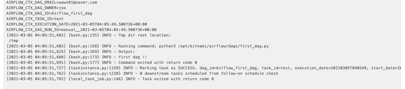 잘 실행이 되었다면, 로그를 통해서 Dag이 잘 끝났는지 볼 수 있습니다.