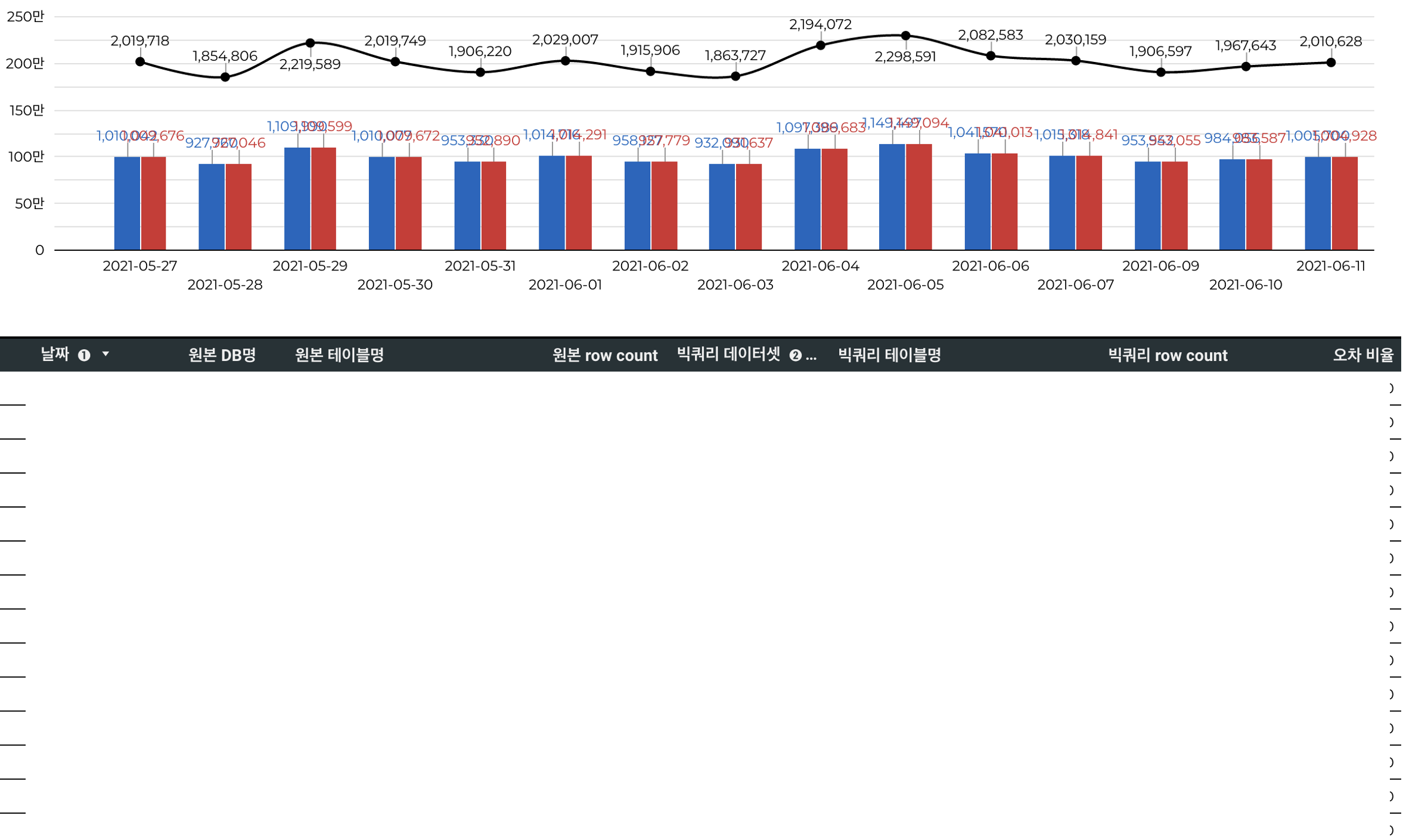 그래서 데이터가 정상적으로 적재가 되었는지 원천 데이터와 최종 목적지의 데이터를 비교해서 데이터의 적재가 정상적으로 이루어졌는지 확인은 매우 중요하다고 봅니다. 저는 2가지 방법을 통해서 데이터가 정상적으로 잘 적재되었는지 체크하였습니다.