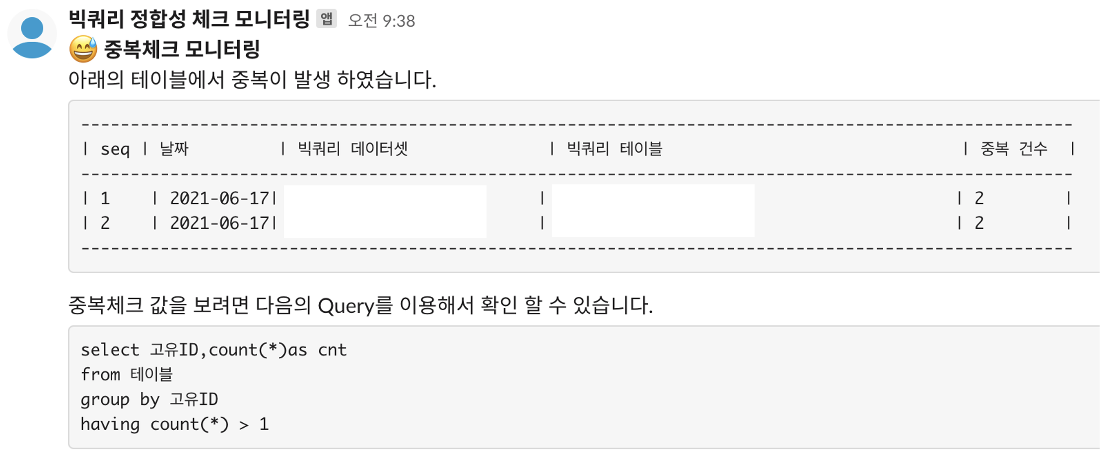 추가적으로 위의서 발생한 데이터를 모니터링 RDB에 저장하고 이를 아래와 같이 Slack 알람으로 발송하여 중복을 확인 할 수 있습니다.