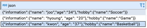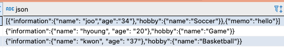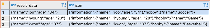 SELECT '{"information":{"name": "hyoung", "age": "20"},"hobby":{"name":"Game"}}' AS json UNION ALL