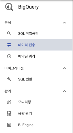 bq 명령어를 통해서 작업을 만들면 아래의 스크린숏과 같이 "데이터 전송" 부분에서 결과 및 상황을 확인할 수 있습니다.