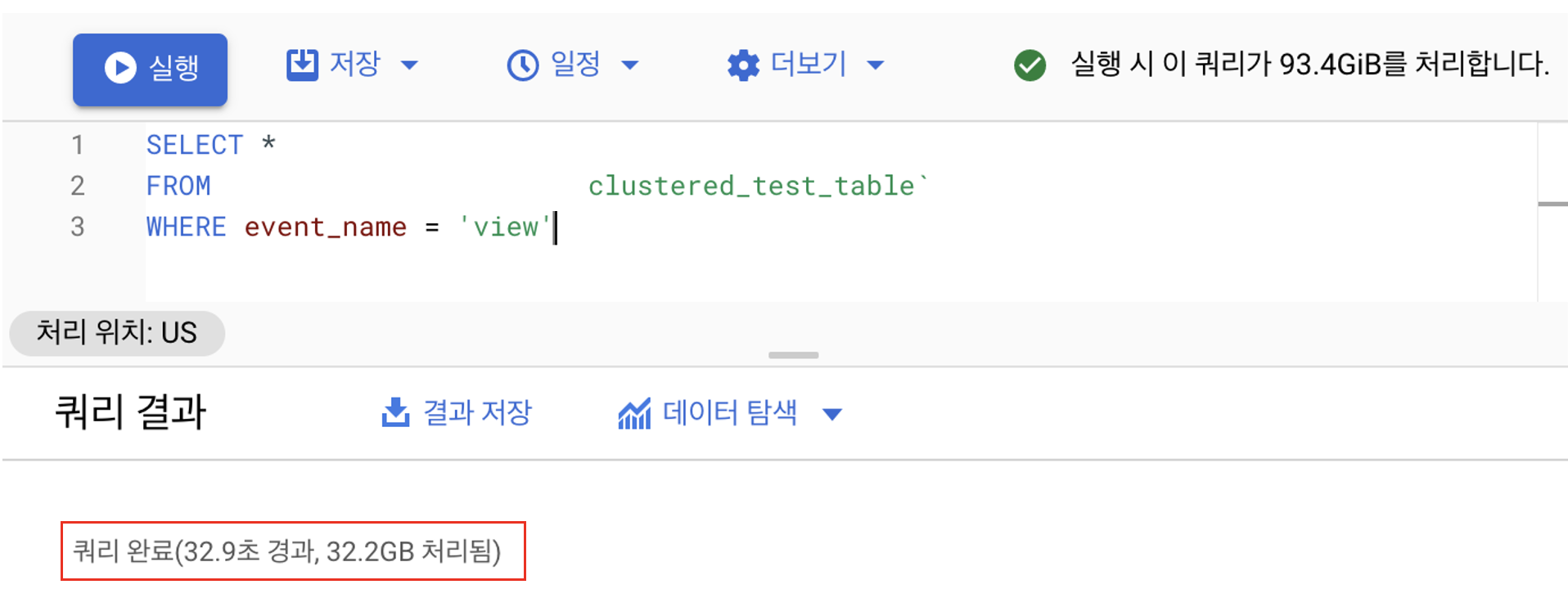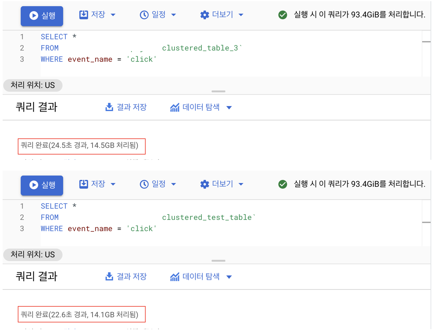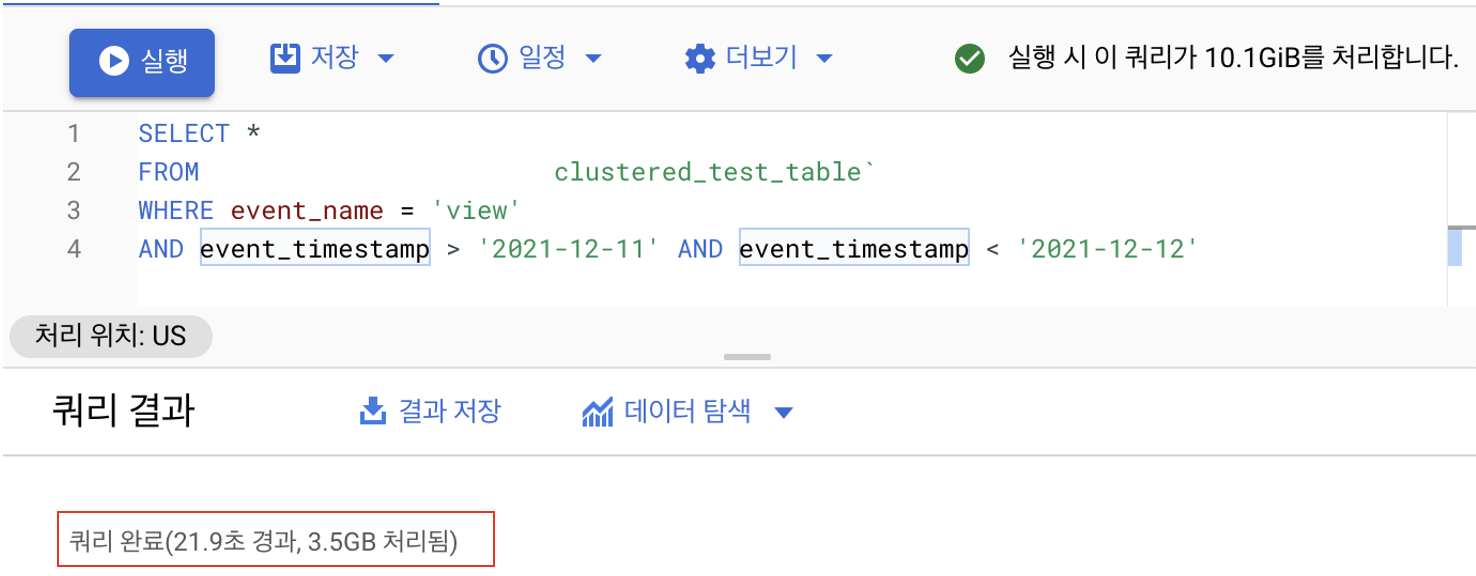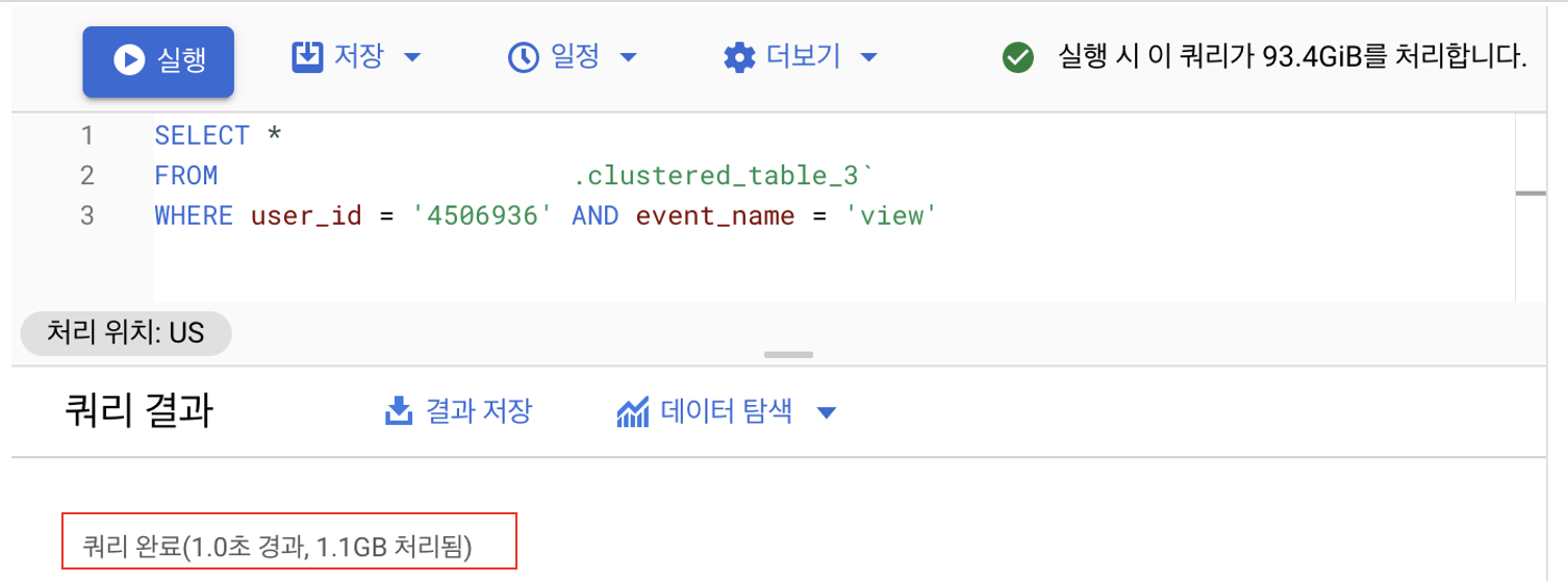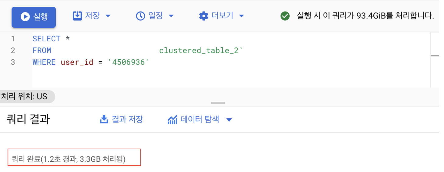 데이터의 예상 비용은 역시나 차이가 없습니다. 전체 테이블을 읽는 것과 같은 비용을 예상 비용으로 표기하고 있습니다. 실제로 실행해봤는데 결과가 매우 놀랍습니다... 엄청나게 차이를 보입니다. 처리 시간이 엄청나게 눈에 보이게 줄었습니다. 데이터를 처리하는 비용 또한 엄청나게 줄었습니다. 클러스터링의 효과가 이렇게 실감이 되는 게 신기합니다.