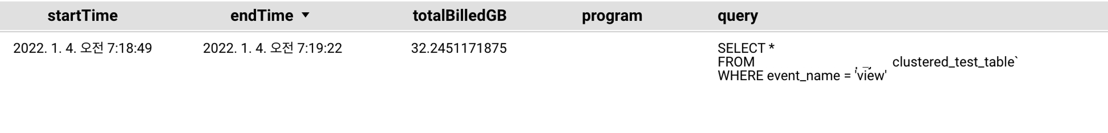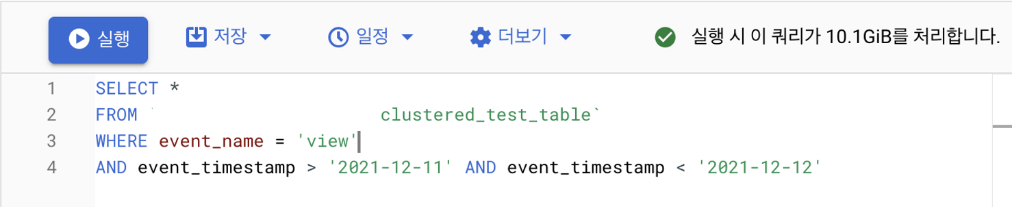 이 내용은 공식 홈페이지에 클러스터링을 사용해야 하는 경우에 대해서 이야기할 때 가장 처음에 등장하는 내용입니다. 아마도 파티션 단위로 데이터를 나눠놨기 때문에 예상 비용을 위와 같이 전체 테이블 단위로 보여주지만 실제 데이터를 읽을 때는 클러스터링 된 정렬된 데이터를 일부만 읽기 때문에 위와 같이 예상 비용과 실제 비용이 다르게 나오는 것으로 보입니다. (이 부분도 추측입니다.)
