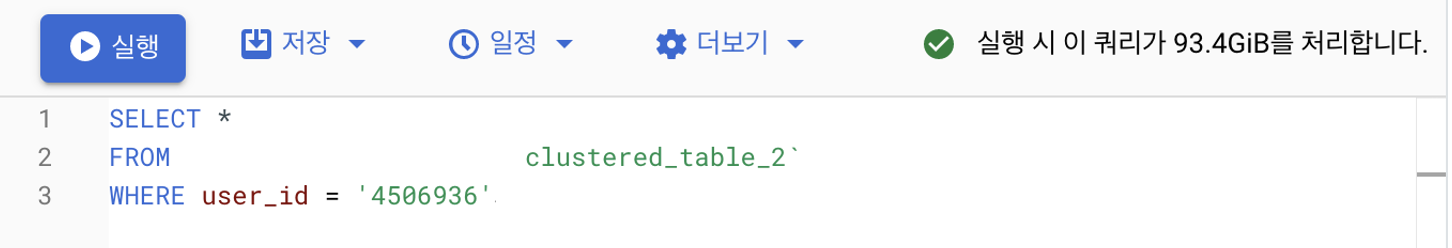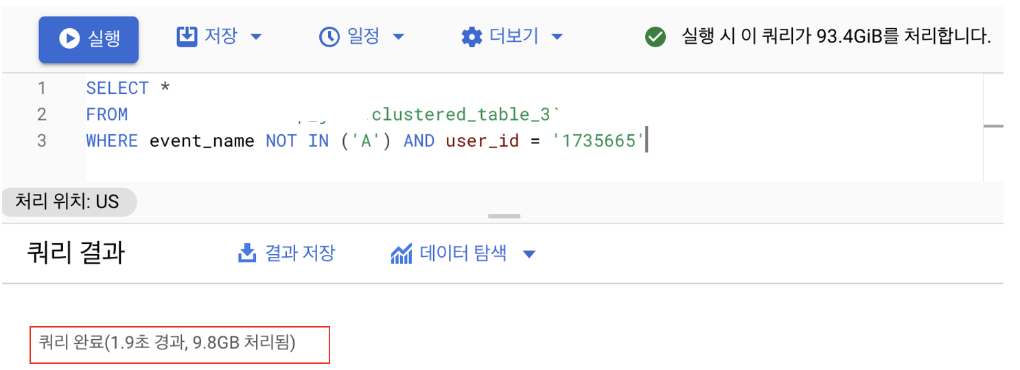 물론 user_id만 클러스터링 된 테이블보다는 성능과 비용이 덜하지만 충분히 훨씬 빠르고 크게 비용이 절감되는 것을 볼 수 있습니다. 이렇게 사용하면 최적의 성능까지는 아니지만 엄청나게 크게 도움이 될 것으로 보입니다.