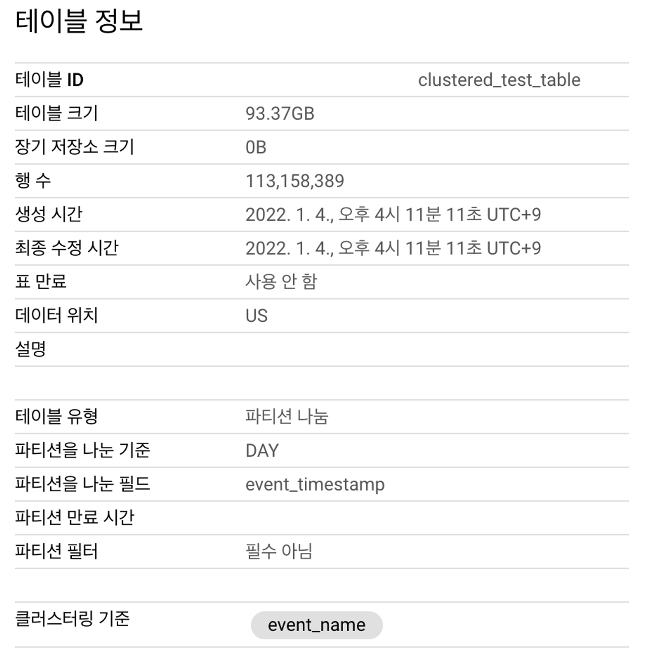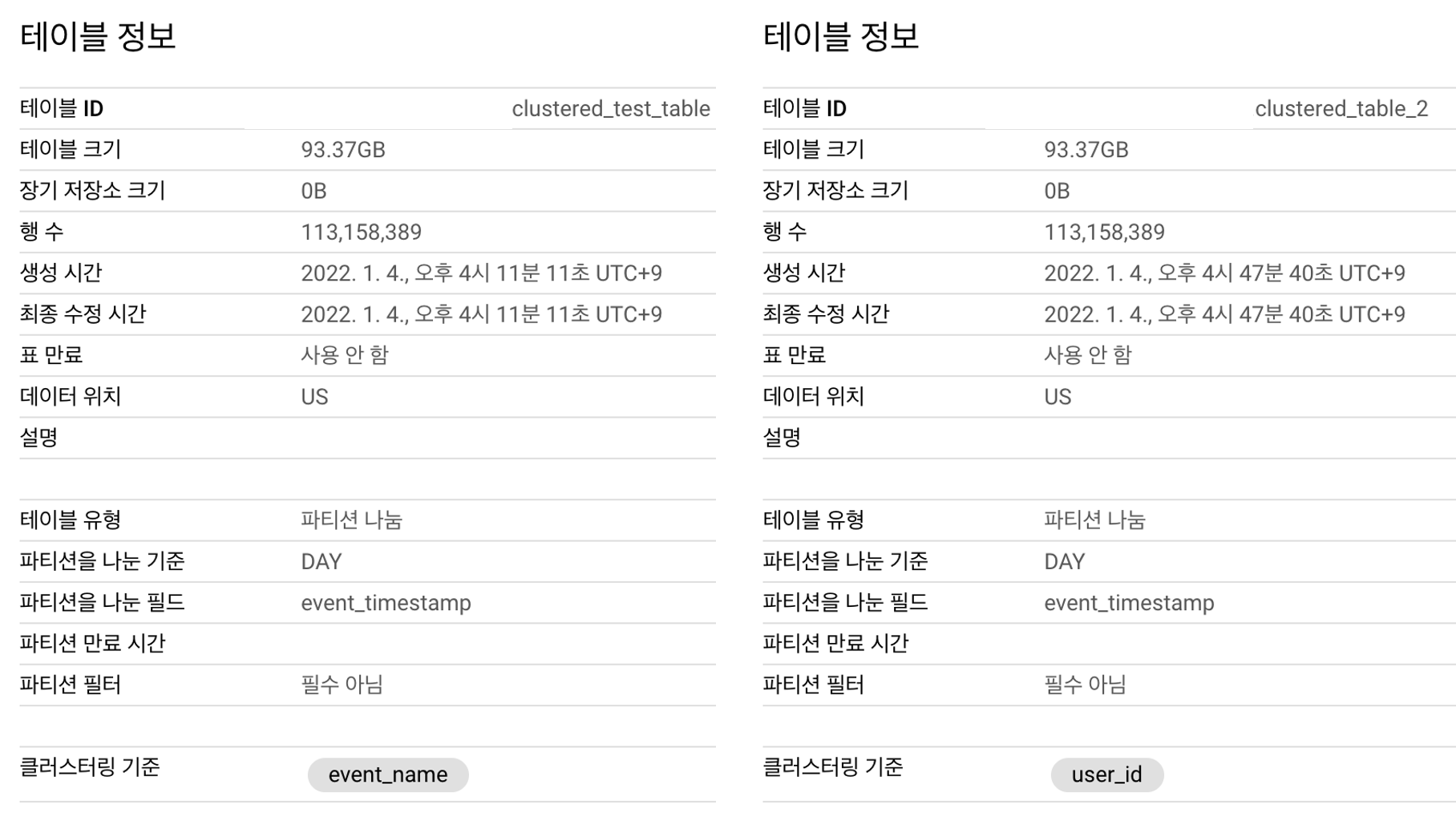 테이블이 설마 안 만들어지지 않을까? 싶었는데 테이블은 잘 만들어졌습니다. 테이블을 보면 기존의 event_name으로 클러스터링을 잡은 것과 user_id로 클러스터링을 잡은 것과 클러스터링 기준을 제외하고 다른 부분이 한 개도 없습니다.
