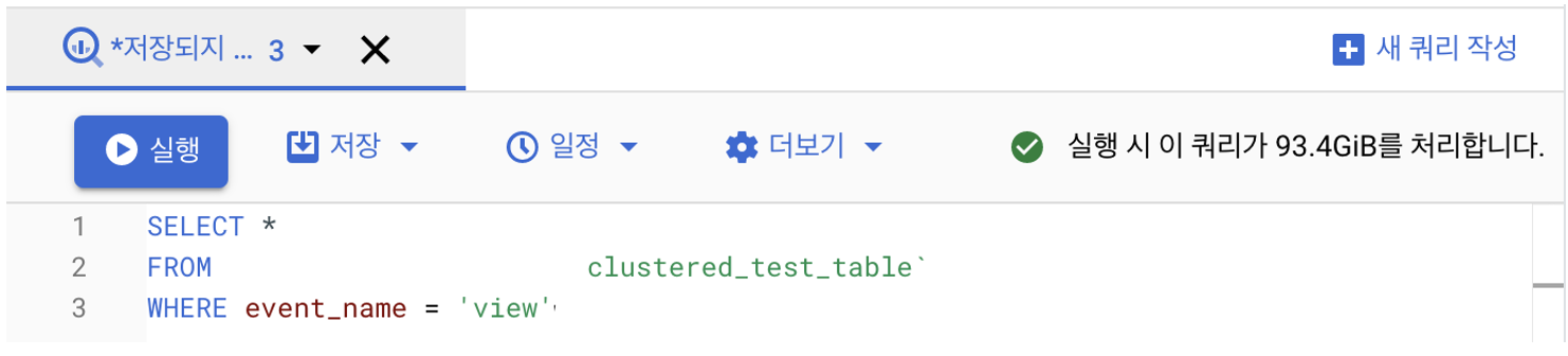 데이터를 SELECT 하면 어떻게 되는지 확인해 보겠습니다. 위에서 event_name을 통해서 클러스터링을 만들었습니다. 위에 스크린숏을 보시면 클러스터링 기준에 event_name이 잘 들어가 있는 것을 볼 수 있습니다. 하지만 아래의 내용을 보면 예상 실행 비용이 전체 테이블을 조회하는 것과 똑같습니다. 이상합니다. 클러스터링을 정확히 가져오지 못하는 것인가..?라는 생각이 듭니다. 혹시 모르니 그대로 실행하겠습니다.