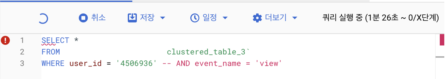 테이블에 보면 user_id라는 칼럼이 있습니다. 아마도 유저의 고유키 값으로 보입니다. 이 칼럼을 이용해서 클러스터링을 만들어서 어떻게 되는지 테스트를 진행해 봤습니다. 데이터의 경우 기존의 사용했던 데이터를 그대로 복사하여 클러스터링 칼럼만 변경하였습니다.