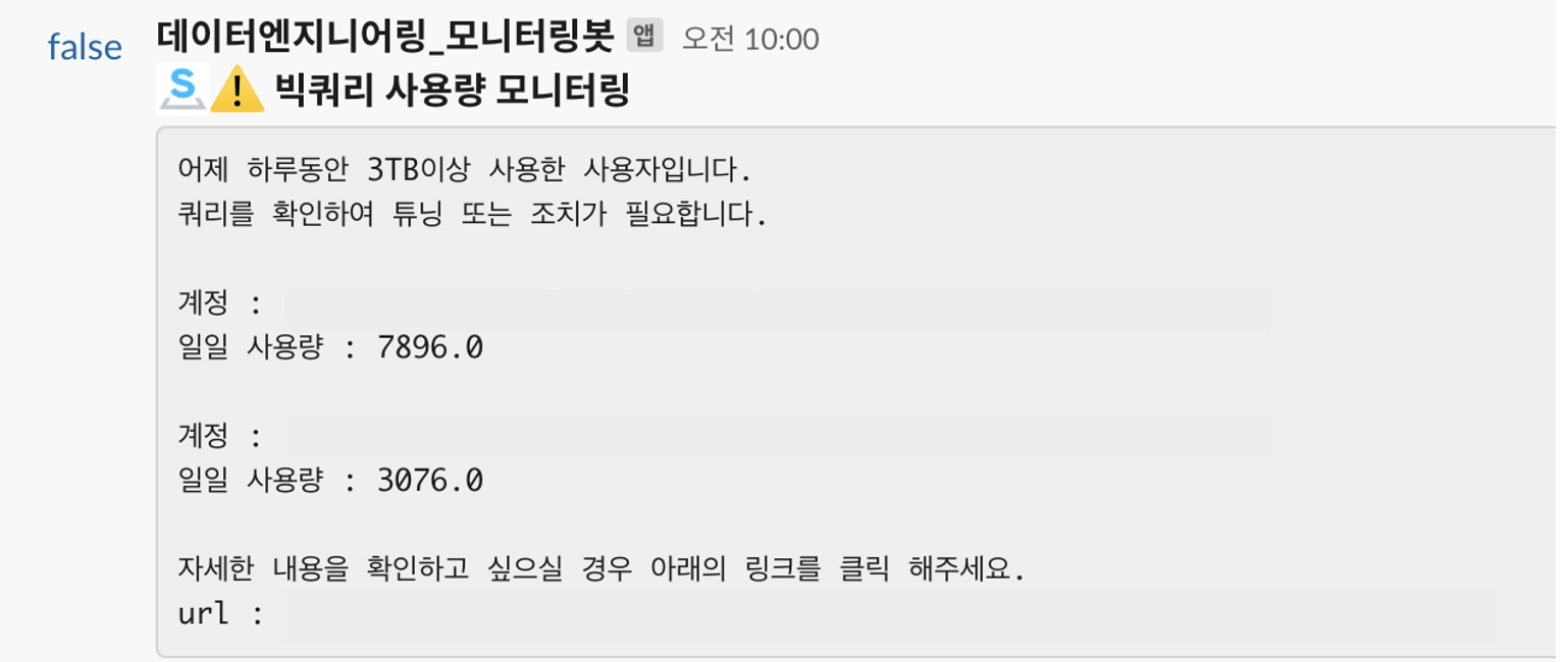 해당 지표의 경우 위에서 언급한 RDB에서 데이터를 가공하여 1시간에 한 번씩 스냅숏을 찍어서 저장 한 뒤에서 해당 데이터를 Datastudio를 통해서 지표로 보여주는 방식입니다. 위의 내용에서 전부 빈칸으로 보여주는 이유는 실제 사용하고 있는 대시보드 화면이므로, 많은 부분을 빈칸처럼 보이도록 처리하였습니다. 이렇게 지표를 통해서 한 번에 어떠한 사용자가 비용을 많이 사용했는지 보여줄 수 있고 추가적으로 Slack을 통해서 특정 Query 비용을 초과한 사용자의 경우 알람을 받도록 하고 있습니다.