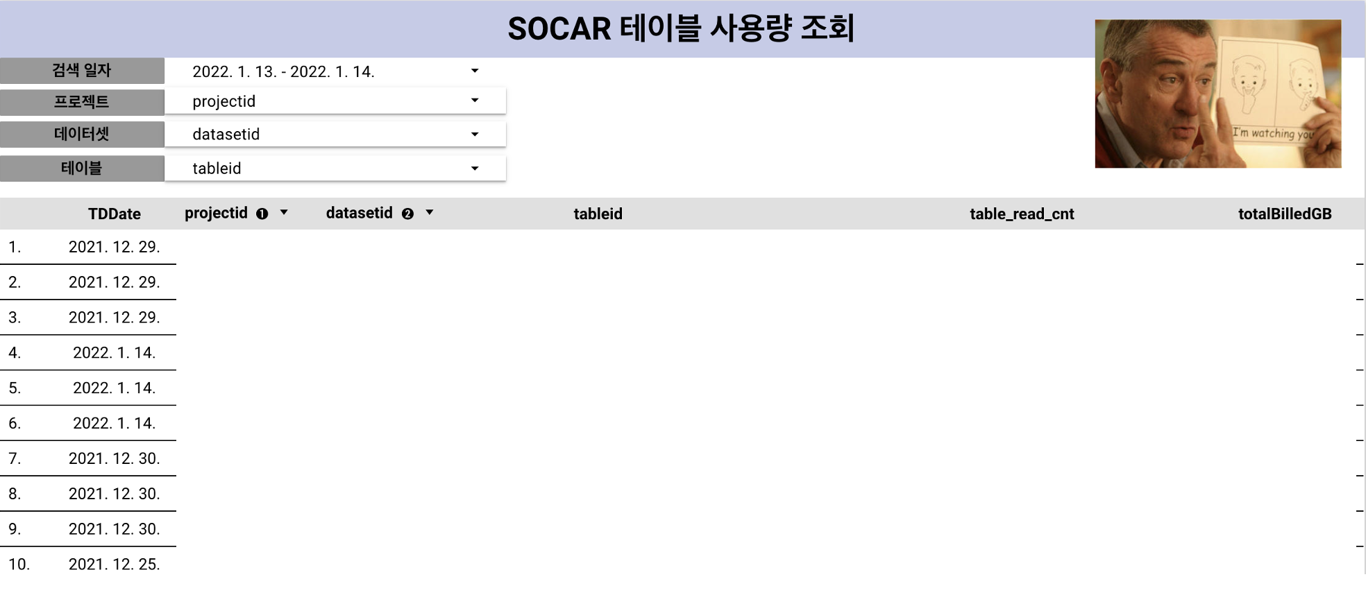 BigQuery 운영을 하면서 가장 처음 만들었던 부분이 Query의 사용량을 수집하는 것이었습니다. 처음에 Query를 얼마나 누가 사용하는지 몰랐을 때는 그냥 많이 나오면 많이 나오니 줄여야 한다. 조금 써야 한다. 이렇게만 이야기할 수 있었지만 이제는 누가 얼마나 어떻게 쓰는지 알 수 있기 때문에 근거를 통해서 줄이 수 있는 건 줄이고 효율적으로 만들 수 있는 부분은 효율적으로 사용하여 비용을 관리할 수 있게 되었습니다.