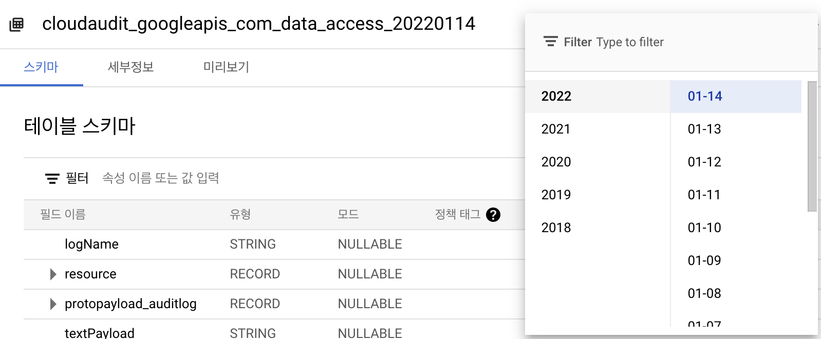 위의 공식 블로그에서 나오는 내용을 보면 GCP의 기능 중 하나인 Stackdriver를 통해서 데이터를 수집하고 이를 BigQuery에 Export 하는 방법으로 BigQuery에 Query 로그를 저장한다고 합니다. 이렇게 저장된 로그는 다음과 같이 샤딩 테이블로 만들어져서 일자별로 데이터를 쌓게 됩니다.