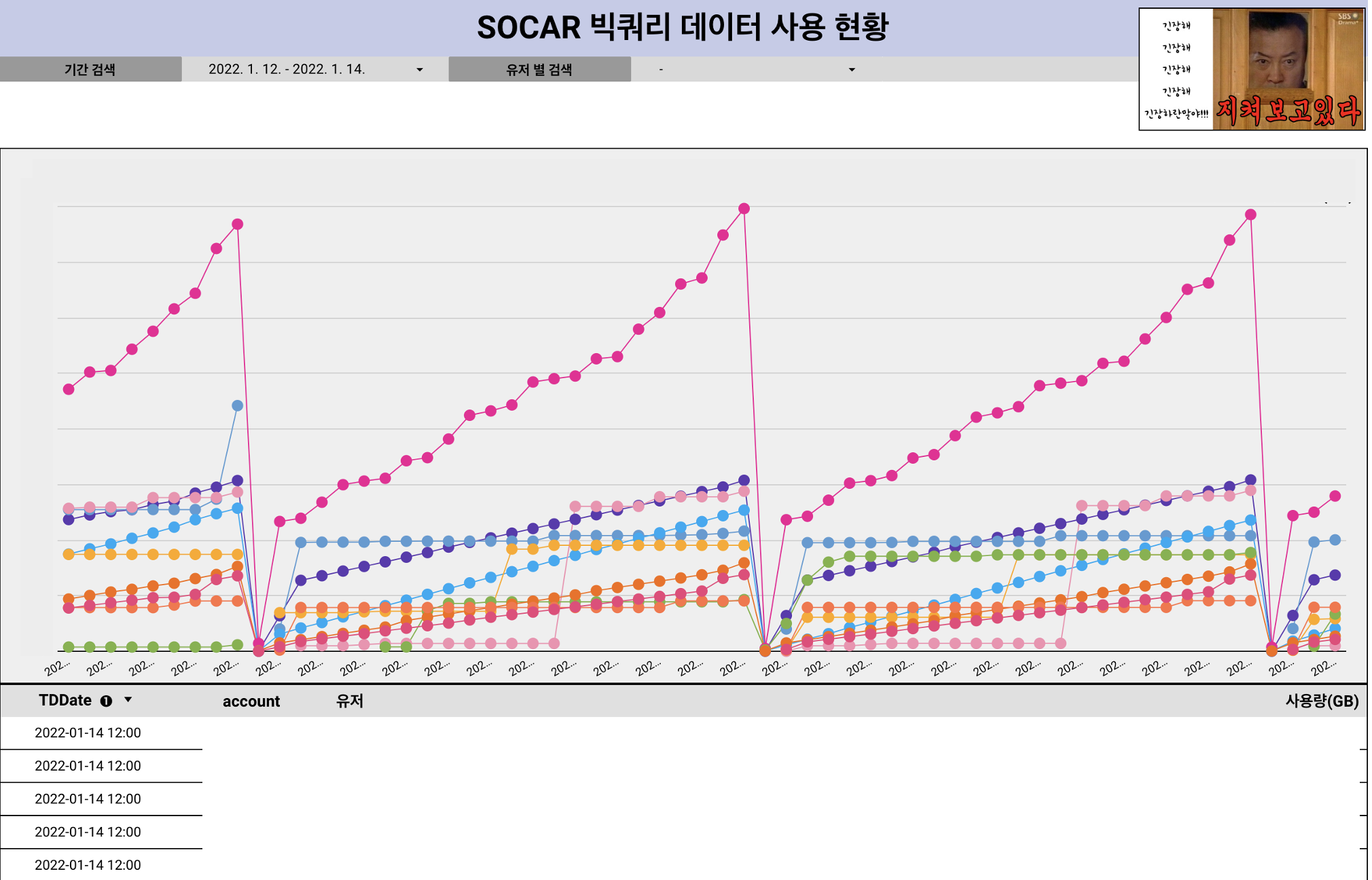 Query를 어떻게 실행 하느냐에 따라서 엄청난 비용을 절약할 수 있고 이러한 모니터링을 만들어두면 여러모로 도움이 많이 됩니다. 사용자들에게 무작정 데이터를 많이 쓰지 못하게 하는 것보다는 효율적으로 만드는 방법을 알려줌으로써 모두가 데이터에 손쉽게 접근하고 손쉽게 사용하게 하는 것을 목적으로 하였기에 누구나 접근이 가능한 구조이므로, 데이터를 잘 모르고 쓰실 경우 비용 폭탄을 맞기 쉽습니다.