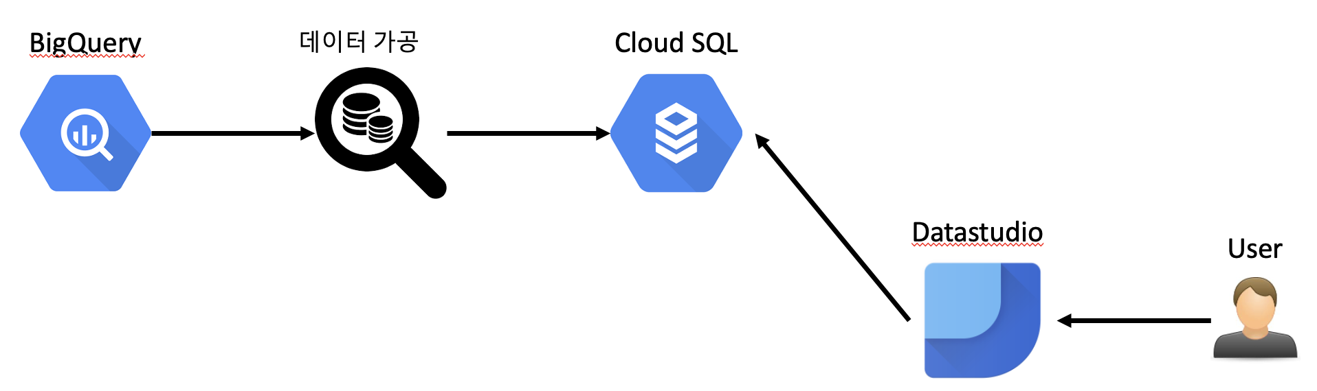 위와 같이 이 경우 Query를 계속해서 날려서 사용자를 조회해야 하므로 이 Query만으로는 여러 사용자를 보면서 운영을 하기 어렵습니다. 그래서 위의 구성도와 같이 구성하여 RDB에 데이터를 저장하고 이를 Datastudio에서 불러오도록 통일해놨습니다. 데이터를 주기적으로 스냅숏을 찍어서 집계하여 보여준다면, 저렴한 비용으로 여러 가지 형태로 데이터를 볼 수 있습니다.