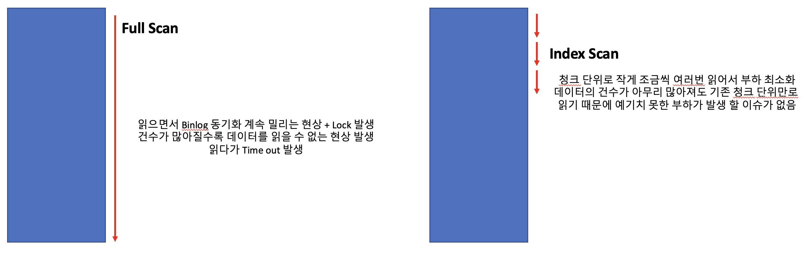 위와 같이 created_at과 updated_at을 기반으로 일자 또는 시간별등등으로 데이터를 가져오고 OR조건을 걸어서 두 개 전부 가져오게 할 수 있습니다. 이 경우 복합 인덱스가 아닌 Composite Index로 INDEX Seek를 하여 RDB에 부하를 최소화하여 가져올 수 있습니다. 결론적으로 위의 ID값을 가져오는 것과 마찬가지로 새로 생성되었거나 변경된 부분만 정확하게 가져오기 때문에 Table Scan이 발생하지 않아서 RDB에 부하를 최소화하는 것입니다.