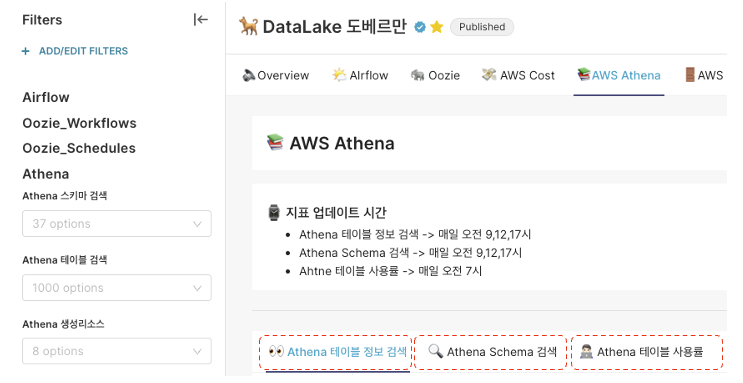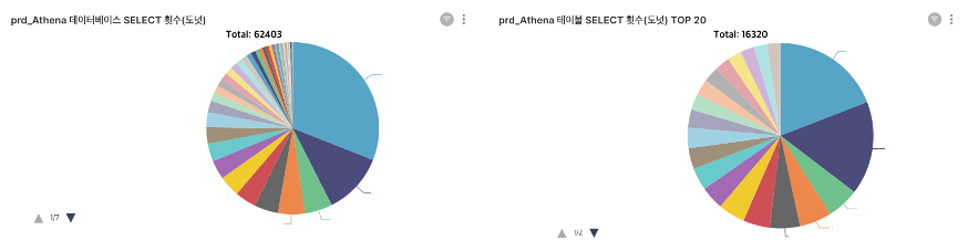 추가적으로 요청을 받아서 만든 내용인데, Athena에서 가장 많이 사용되는 DATABASE와 TABLE에 대한 집계 정보를 보여주는 지표를 만들어서 사용자들에게 제공하였는데 반응이 굉장히 좋았습니다.