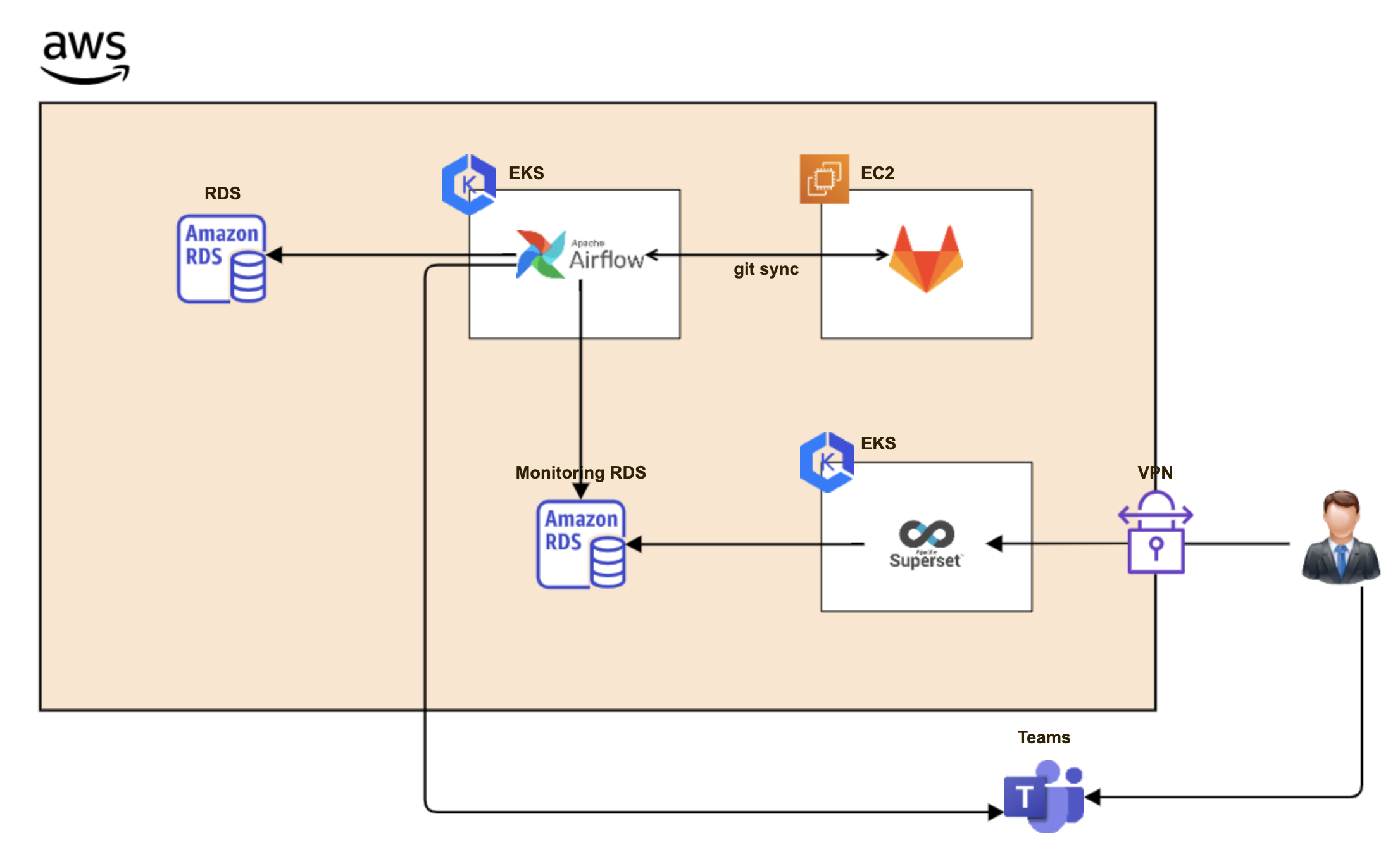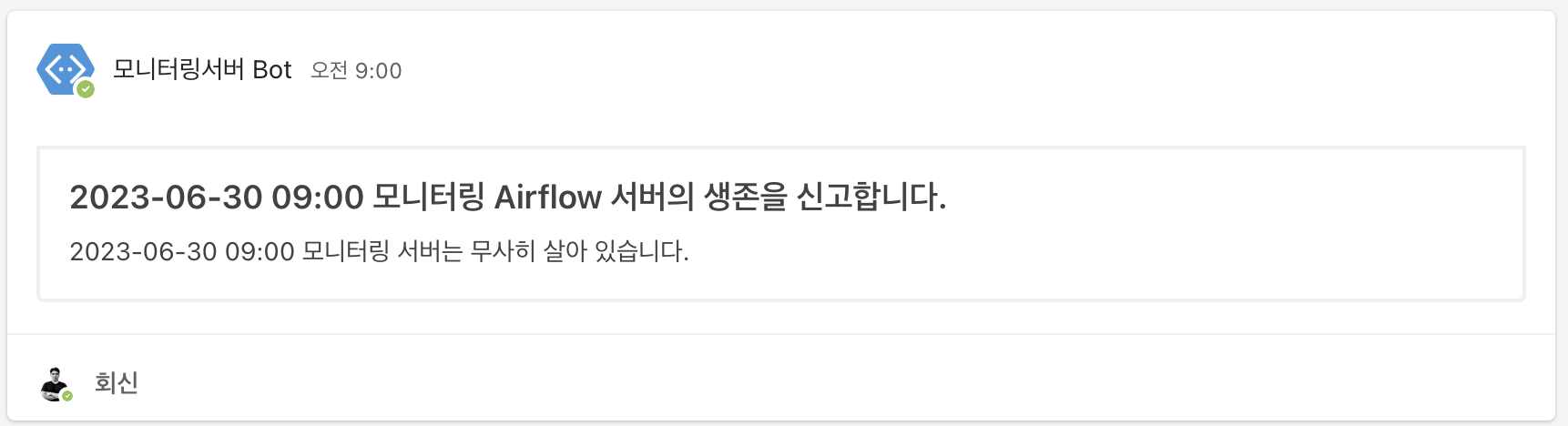 데이터는 대부분 Batch 성이고 모니터링이라서 고가용성이 크게 중요하지 않다고 판단하여 Airflow가 EKS위에 있지만 Local Executor를 사용 하였습니다. 물론 고가용성이 중요하진 않다고 하지만 죽으면 모니터링이 잘 안 되거나 지표가 나오지 않으므로 Health Check 겸으로 Teams에 본인이 살아 있음을 알리는 메시지를 매일 오전에 보내도록 하였습니다.