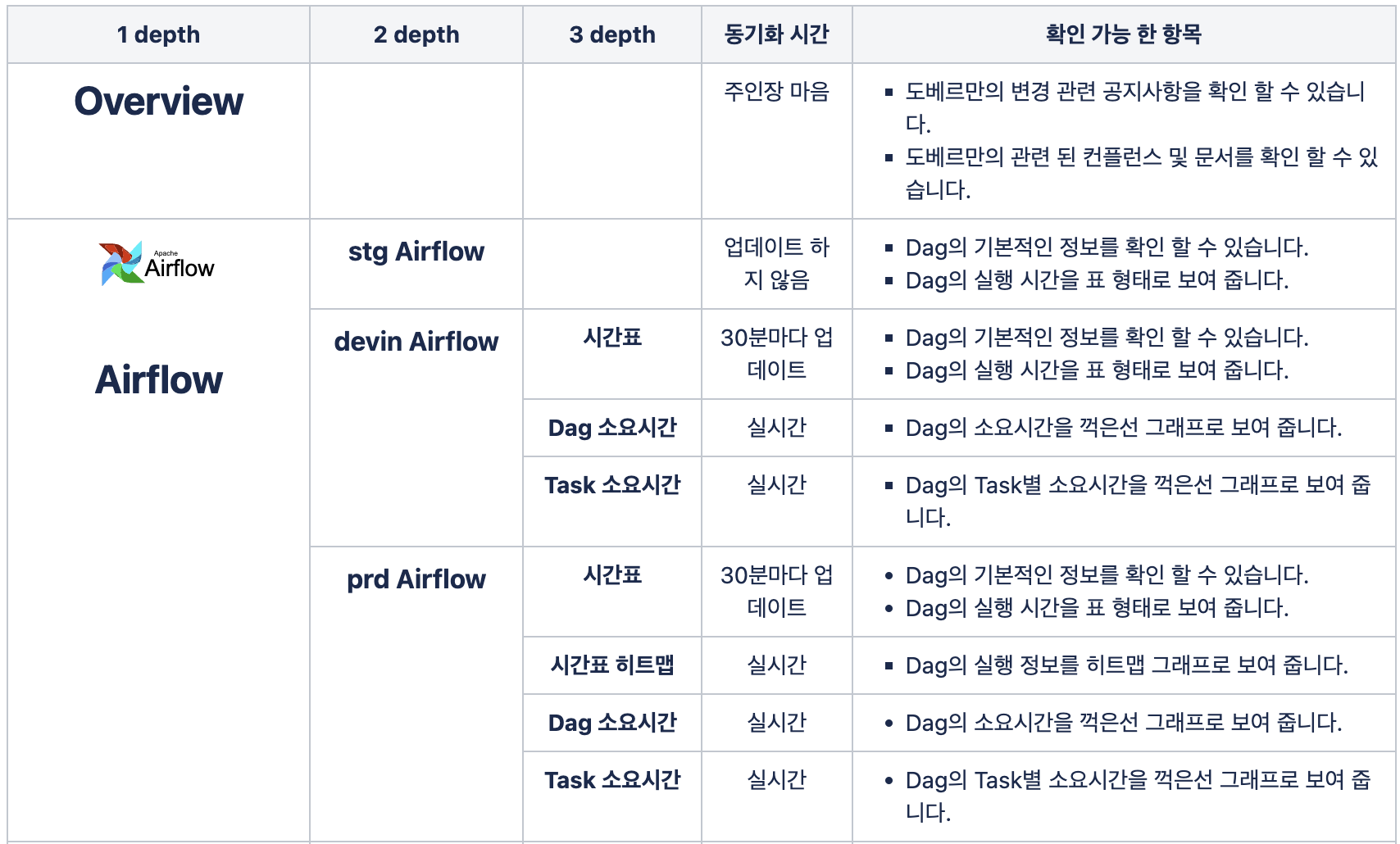이 부분도 역시 요청을 받아서 만들었습니다. 사용자는 이러한 시스템을 경험해 본 적이 없기 때문에 무엇을 어떻게 봐야 할지 알 수가 없습니다. 그래서 아무리 시스템을 잘 만들어도 사용자가 사용하기 불편하면 아무런 소용이 없습니다. 그렇기에 Navigation 페이지를 만들어서 어떠한 지표가 어느 곳에 존재하는지 한눈에 볼 수 있는 문서를 만들고 지속적으로 업데이트하여 제공하였습니다.