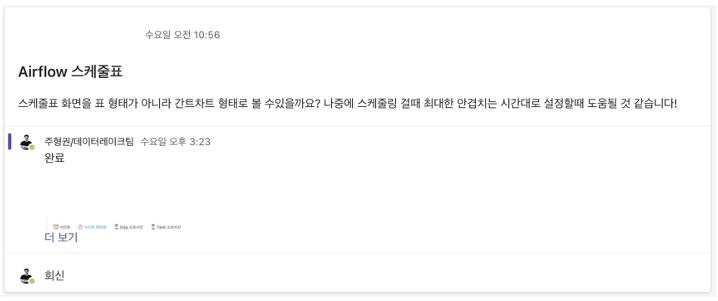 이 역시 PythonOperator를 통해서 Teams로 전송하였습니다. Teams가 좋으면서도 안 좋은 부분은 채널마다 커넥터(Webhook)를 따로 만들어서 해야 하는 번거로움이 있습니다. Slack의 경우 Webhook을 하나만 만들고 채널 ID만 변경해서 보낼 수 있지만 Teams의 경우는 일일이 커넥터를 만들어서 입력해야 합니다. (혹시 아시는 분... 메일 주세요.)