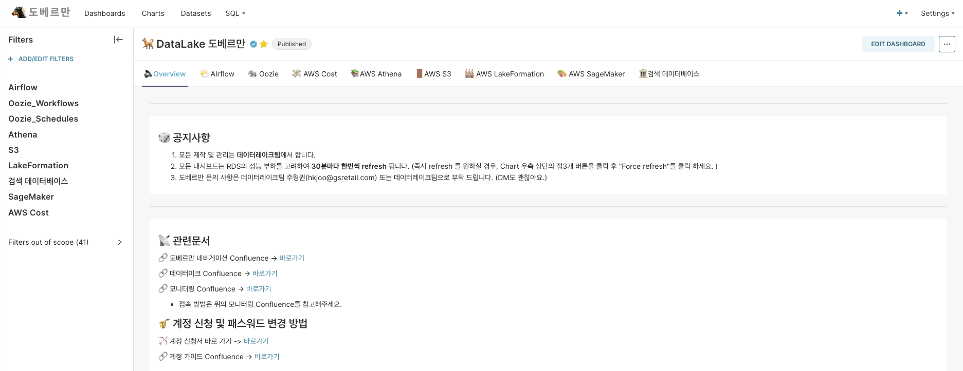 데이터의 시각화는 기존에 회사에서 사용하는 시각화 도구가 상용이라서 추가적인 라이센스 구입을 요청하기 어려워서 Superset을 선택하였습니다. 예전에 잠깐 해본 적이 있는데 꽤 괜찮은 도구라고 생각해서 Superset을 선택하였습니다. Superset의 경우 RDS 쪽에는 붙는 게 크게 문제가 없고 웬만한 RDB를 지원하기에 편하게 연동하여 시각화하였습니다.