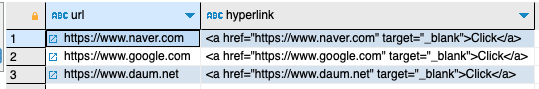 데이터를 불러 올때 미리 hyperlink를 만들어서 불러오면 Query의 결괏값은 조금 이상하게 나오지만 실제 표에서는 정상적으로 출력됩니다. 결과를 보면 다음과 같습니다.