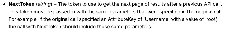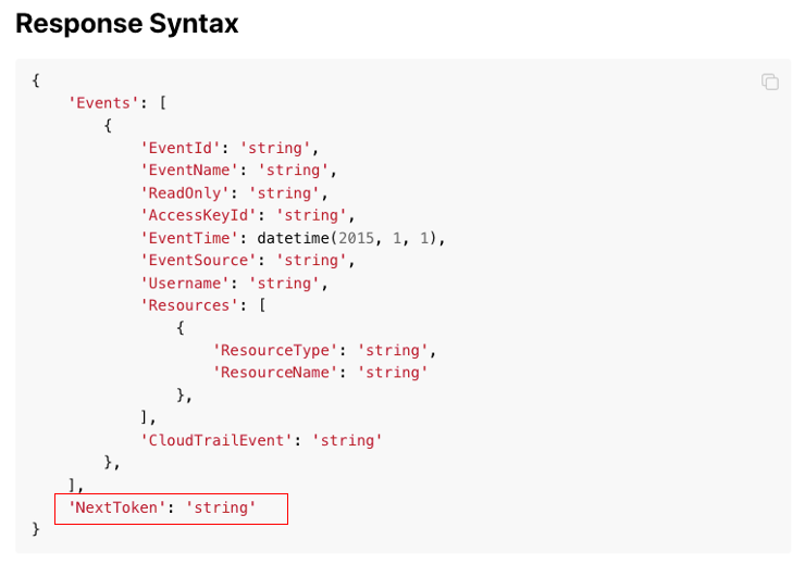 위의 내용과 같이 response를 가져와서 적재하면 끝나겠지만... lookup_events는 next_token으로 다음 페이지를 보고 계속해서 가져와야 합니다. response를 받을 수 있는 최대 건수는 50건이 제한이라서 만약에 가져오는 값이 50건이 넘을 경우 next_token을 넣고 While로 가져와야 합니다. (While로 가져오는 내용은 여기에...)