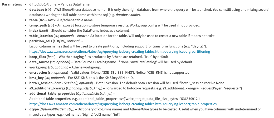 또한 awsrangler는 다음의 파라미터를 받아서 사용합니다.