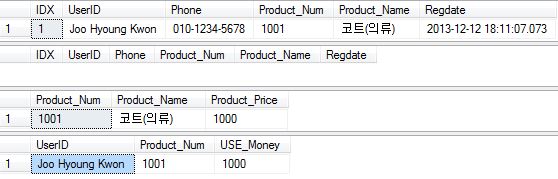 EXEC @VAL = USER_BUY 1,'Joo Hyoung Kwon','010-1234-5678',1001