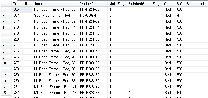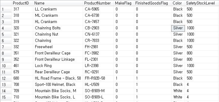 Production.product 테이블의 SELECT 결과는 다음과 같습니다.