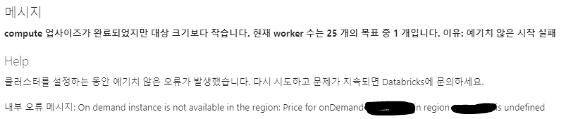 분명히 Job Cluster를 만들 때 인스턴스 타입 선택도 가능 했고 실제로 Workflow에서 작업은 계속해서 실행 중이었습니다. 그런데 늘어나지 못하고 계속해서 2개를 유지하는데, 황당하게도 해당 리전에서 해당 인스턴스 타입을 사용할 수 없다는... 로그가 찍혀 있습니다.
