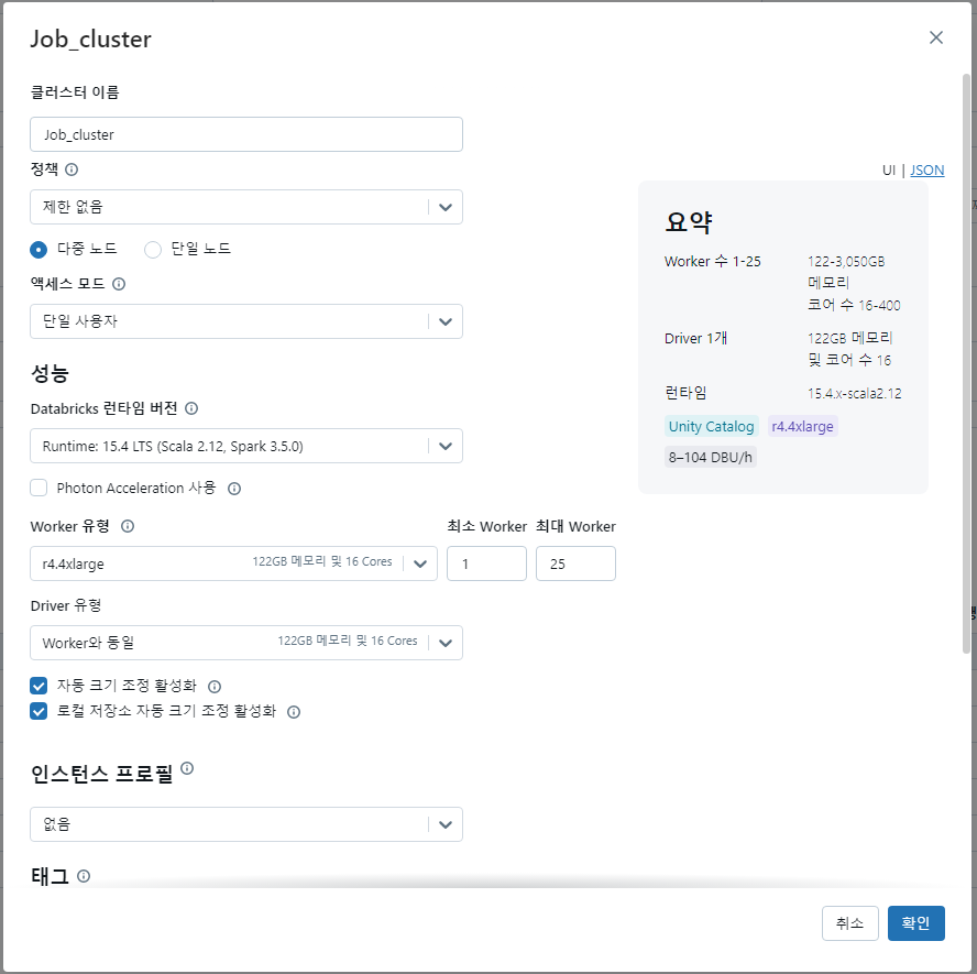 Workflow에서 Notebook의 SQL 또는 Python 코드등을 실행하는 경우가 있는데 이때 Job cluster에 Worker 유형을 선택할 수 있으며 분산처리를 위해서 최소~최대 Worker의 개수를 설정할 수 있습니다.