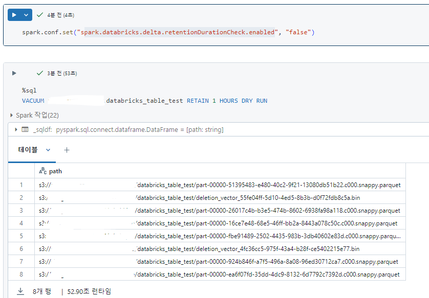 8개의 파일을 삭제하도록 나옵니다. 실제로 vacuum을 수행하고 물리적 위치(S3)에 들어가서 파일을 보면 파일이 삭제된 것을 확인할 수 있습니다.