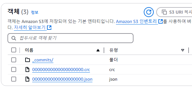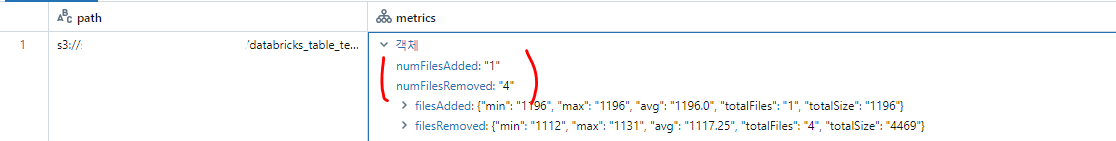 위의 내용을 보면 파일 하나를 추가하고 파일 4개를 지웠다고 나옵니다. 하지만 실제로 S3 폴더에 가보면 파일은 줄어들지 않았습니다. 파일을 물리적으로 실제로 지운게 아니고 지워진 내용은 건너뛰라는 의미입니다. 그래서 Optimize 작업을 하여 기존에 필요 없는 파일을 건너뛰어서 성능이 올라갈 수 있습니다. 이러한 작업을 확인하기 위해서는 다음과 같은 명령어로 확인이 가능합니다.
