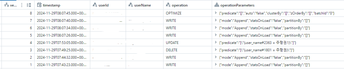 파일은 삭제되지 않고 오히려 파일이 늘어났습니다. 실제로 파일이 삭제되면 delta 테이블(Databricks 기본 테이블)은 파일을 삭제하지 않고 새로운 파일을 만들고 해당 행을 "비활성" 상태로 만듭니다. 이러한 정보는 가장 마지막에 쓰인 스냅샷 파일에 저장되어 SELECT를 하여도 결괏값은 보이지 않습니다. 실제로 SELECT를 하면 결과에 user_name에 "주형권"은 보이지 않고 "주형권 1"만 보입니다.