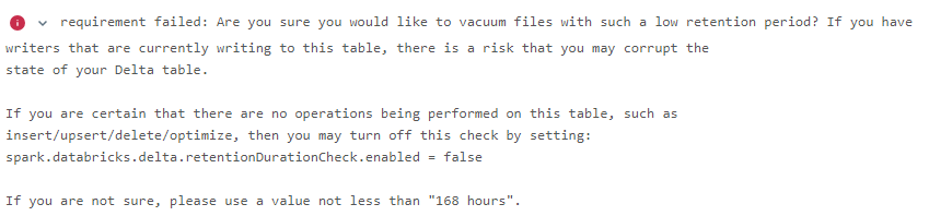 I am trying to set retention period for a delta by using following commands. deltaTable = DeltaTable.forPath(spark,delta_path) spark.conf.set("spark.databricks.delta.retentionDurationCheck.enabled", "false") deltaTable.logRetentionDuration = "interval 1 d