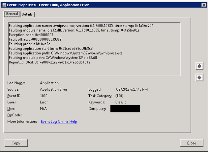 여기서 중요한것은 어떠한 프로그램이 문제를 일으켯는지를 설명을 참조하여 확인하고 그에 맞는 적절한 대처를 해야한다. 이번에 오류에 보면 wmiprvse.exe가 문제를 일으켰음을 알 수 있다.
