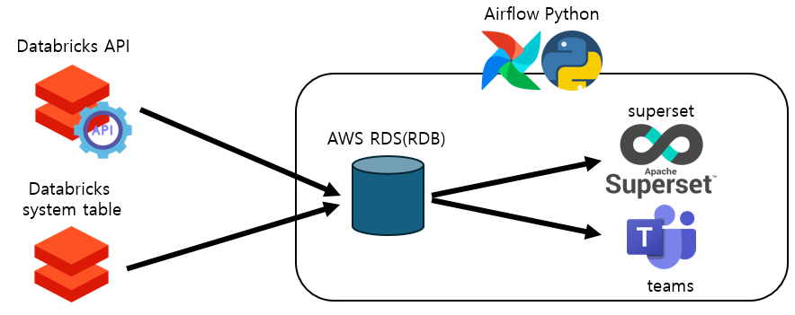 위와 같이 API와 system table에서 데이터터를 가져왔습니다. 그리고 이것을 AWS의 RDS(Aroura)에 저장하고 이를 Superset으로 시각화하고 Teams 메시지로 발송하여 알림을 만들었습니다. 이 모든 과정을 Airflow를 통해서 스케줄 처리하고 Python기반으로 코드를 만들었습니다.