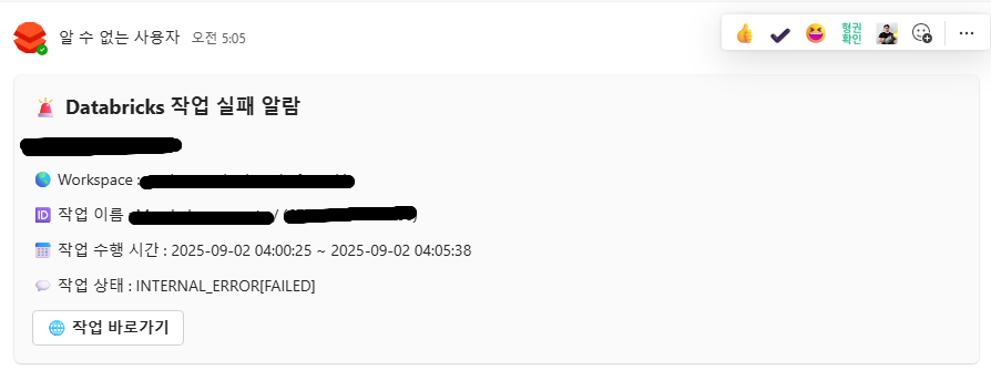 "text": "**🚨 Databricks 작업 실패 알람**"