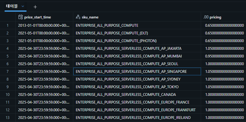 가격표 가져오기(?)라고 하여 이게 뭐지? 싶은 분들이 많으실 겁니다. Databricks의 경우 모든 가격의 표기를 USD가 아닌 DBU (Databricks Unit)으로 하기 때문에 이것을 우리가 볼 수 있도록 하려면 USD로 바꿔줘야 합니다. 그런데 가격이라는 게 환율처럼 항상 변경이 됩니다. 그래서 Databricks 내에서 제공하는 테이블을 통해서 가격표를 매일 가져와야 합니다.