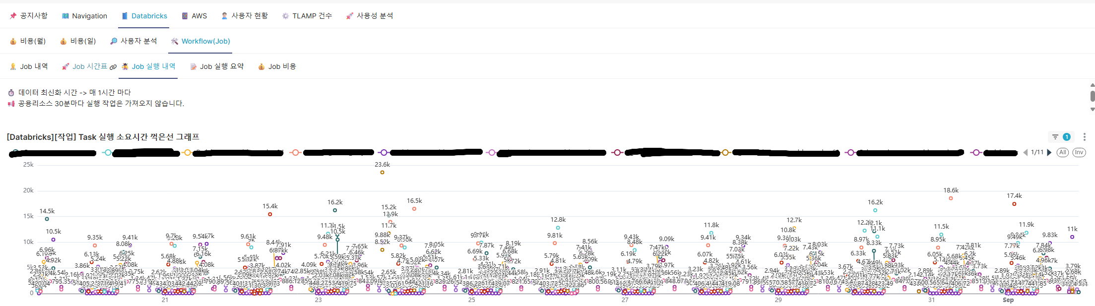 아마도 이 대시보드가 반응이 제일 좋았던 거 같습니다. 비용에 관련해서 민감하기 때문에 대시보드를 통해서 어떠한 Job이 비용이 많이 들어가는지 한눈에 본다면 그만큼 대처가 빠르고 정확해집니다. 이 대시보드를 통해서 몇몇의 불필요하거나 비용이 많이 들어가는 Job에 대해서 튜닝을 통해서 비용을 절감하였습니다.